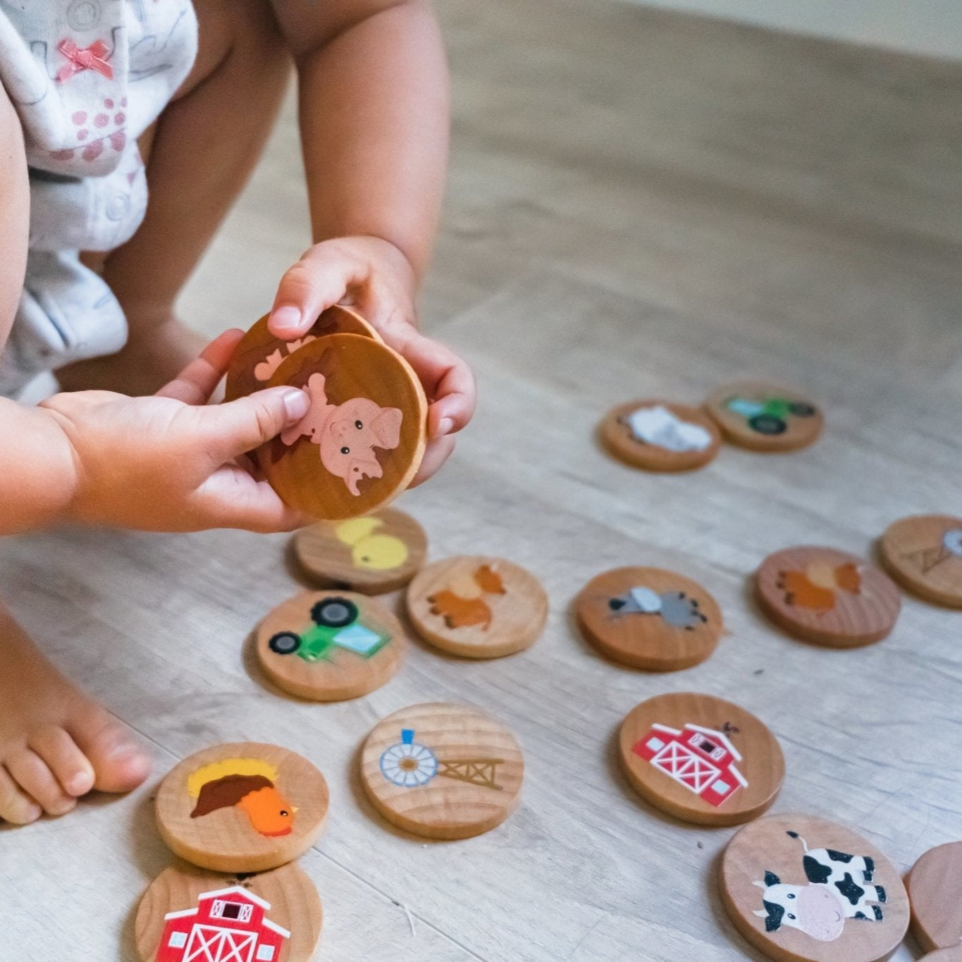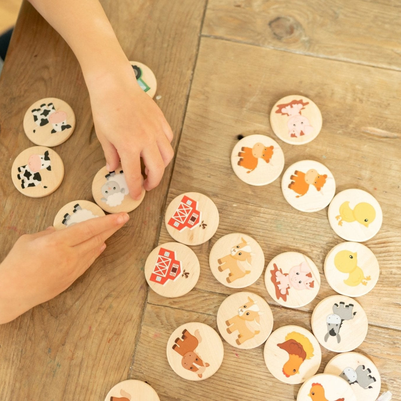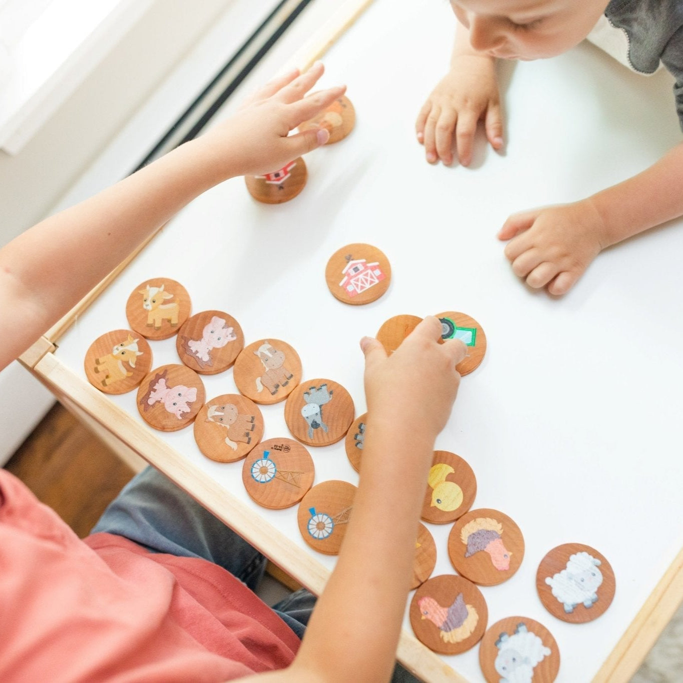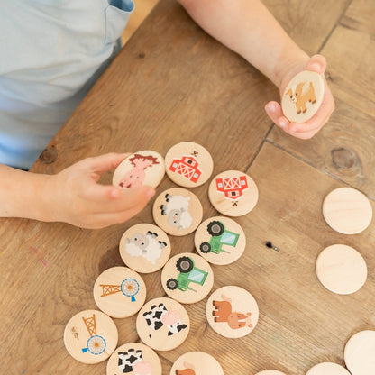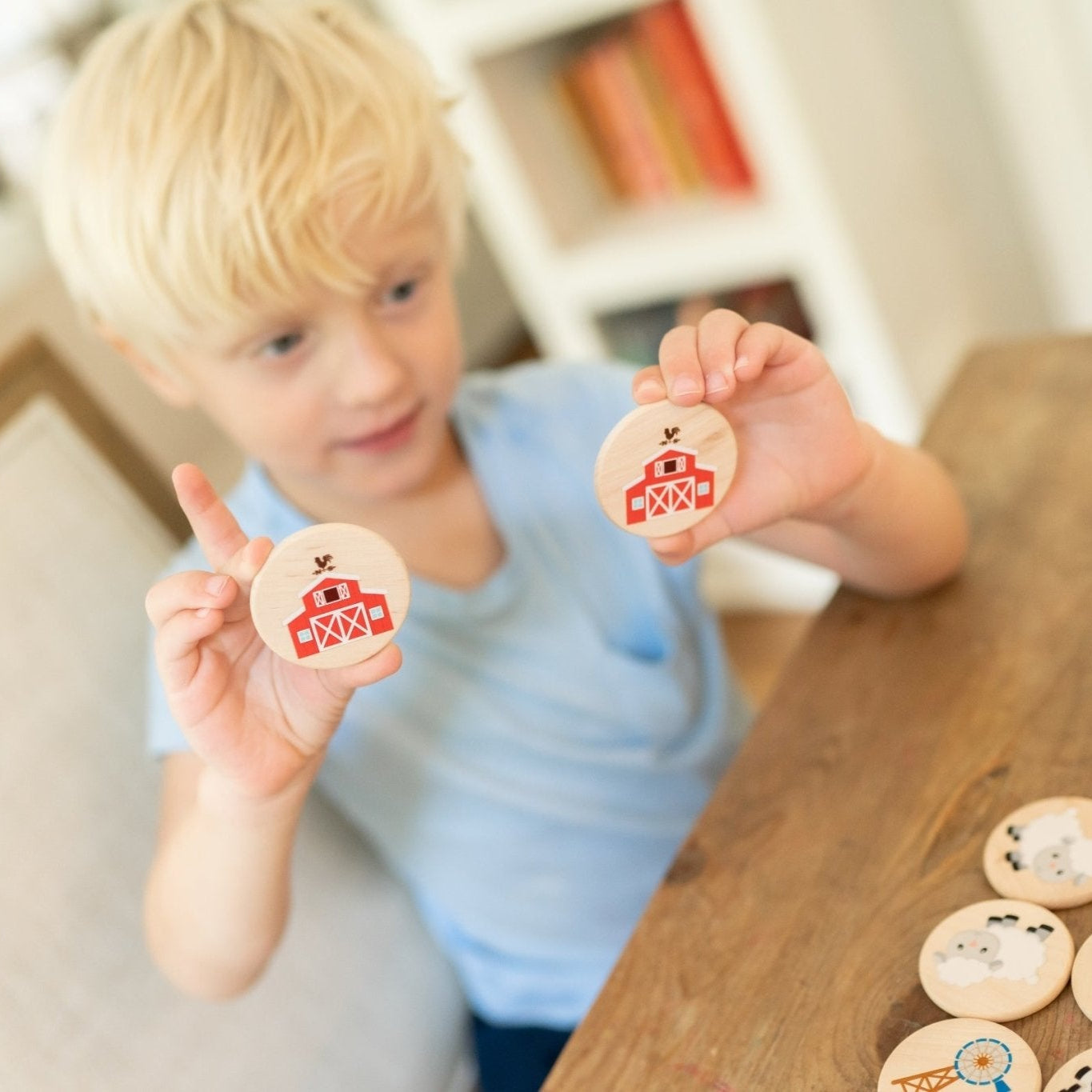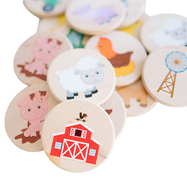 E-I-E-I-O! This fun set from Bannor Toys is full of colorful animals, tractors, barns, windmills and all the fun things found on a farm! Use it as a seek and find game, use it to work on animal sounds, use it as a fun game that can be enjoyed solo or with the entire family - teaching kids to take turns and share with others. The wooden matching tiles also promote short term memory skills. Matching tiles come in a cotton drawstring bag for easy portability and storage. Safe for all ages, this toy is developmentally appropriate for ages three and up.